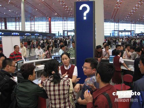 5月12日四川汶川的大地震,造成成都航线停飞,重庆航线临时中断,乘客纷纷到首都机场问讯处打探航班消息。 中新社发 邹宪 摄