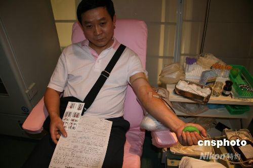 5月12日晚7时许至13日凌晨,数千成都市民前往市内各献血点献血,为四川地震灾区的人们献上爱心。图为田先生在林荫街武侯爱心献血屋献血。 中新社发 杨杰 摄