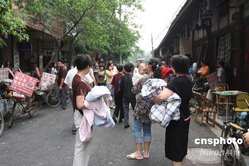 5月12日14时28分,在四川汶川县(北纬31度,东经103.4度)发生7.8级地震,四川省会成都有强烈震感,市民紧急从建筑物中跑出来,在街道上紧急避险。 中新社发 黄荣 摄