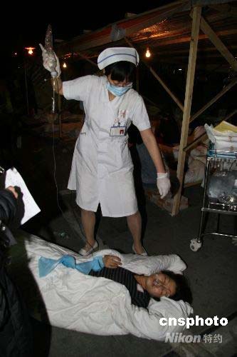 5月12日下午,四川汶川地震后,四川省人民医院的医务工作者在救助来自都江堰的伤员。中新社发 黄家明 摄