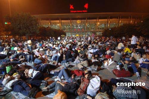 5月12日23点15分,成都站在地震后开出第一趟旅客列车(成都至昆明的2639次)。北京时间5月12日14时28分,在四川汶川县(北纬31度,东经103.4度)发生7.8级地震。成都铁路局管辖范围内的四川、重庆、贵州等地都有明显震感,特别是四川境内更是反应强烈。地震灾害发生后,成都铁路局立即启动旅客列车塌方断道应急预案,所有在途旅客列车均就地停车并采取防溜措施,指派工务部门勘查线路、桥梁、隧道,在确认设备质量可以确保行车安全后,开行货车压道,逐步放行客车。截止5月12日24时,成都局管内除宝成线外,其余各线基本恢复通车,晚点列车陆续开始移动,预计自13日起可逐步恢复运行秩序。中新社发 曹宁 摄
