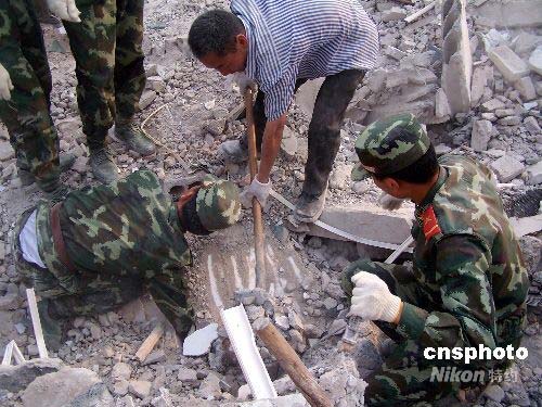 5月12日下午,四川汶川发生7.8级地震,导致重庆梁平县文化镇中心小学坍塌,武警重庆总队梁平县中队官兵在中队指导员唐兵的带领下紧急赶赴现场展开搜救。经过官兵们连续6个小时的艰苦奋战,从废墟中成功救出11名师生。(李刚、陈万金、秦龙兵摄影报道)