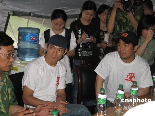 5月29日下午3时许,刘德华、张国立、郑秀文、葛优、冯小刚、陈道明等人来到收治了3000余名地震伤员的成都军区总医院进行慰问。其间,刘德华、张国立、陈道明等人分别发言。一句句鼓励的话语,一声声亲切的问候,给伤员和医护人员带来了快乐和勇气。据了解,这是“5.12关爱行动”的第二站, 此次活动由刘德华和张国立等人发起。中新社发 朱琥姚远 摄