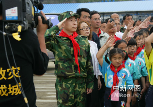 5月30日,航天英雄杨利伟来到总装备部绵阳八一帐篷学校,与孩子们一起欢度六一儿童节。图为杨利伟和小学生们向国旗敬礼。秦宪安 摄