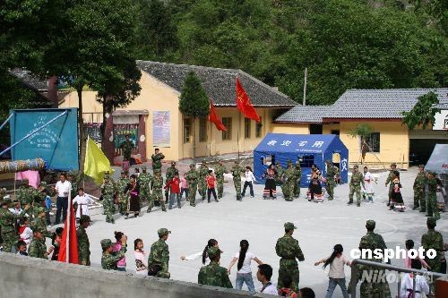 5月29日,“六一”儿童节前夕,四川省平武县木座藏族乡中心小学学生和驻扎在木座藏族乡的济南军区某红军团官兵一起联欢。5月16日,这个红军团从湖北省孝感县千里机动来到这里,官兵们顾不上休息就展开救援工作。木座藏族乡的十几个村小组,分布在700多平方公里的山谷大川中,官兵们分成30多个搜救小分队,深入到各个山沟村寨营救幸存者、拆除危房、搭建帐篷小学、设立救助站,使1700多人有了温馨的家。图为红军团官兵与木座藏族乡中心小学师生跳起 “团结舞”。中新社发 虞平 摄