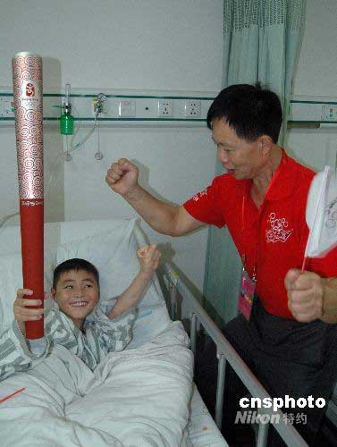 火炬手自发赶到广西医科大学附属医院,看望在这里治疗的四川地震灾区伤员,并让他们在病床上与“祥云”亲密接触,了却看奥运圣火传递的心愿。中新社发 蒋雪林 摄