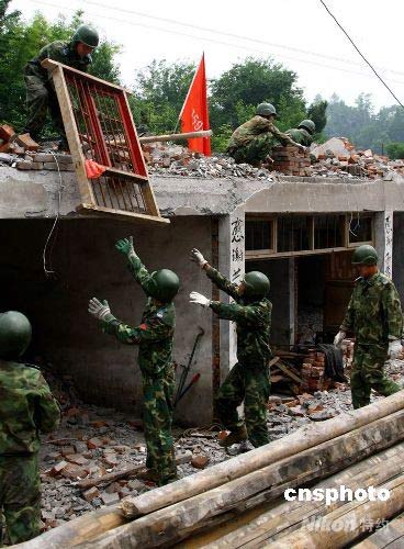 中国空降兵某部“常胜模范连”所在团官兵,进村入户之后,在四川省什邡市蓥华镇帮助受灾群众清理废墟,搭建临时过渡房。中新社发 谭超 摄