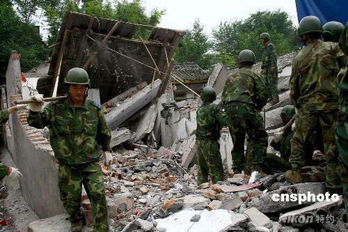 6月8日,中国空降兵某部“常胜模范连”所在团官兵,进村入户之后,在四川省什邡市蓥华镇帮助受灾群众清理废墟,搭建临时过渡房。中新社发 谭超 摄