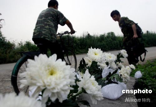 6月13日,在进入成都凤凰山机场的道路上,附近民众自发在路边摆设白花,悼念失事直升机遇难机组人员。中新社发 刘新 摄