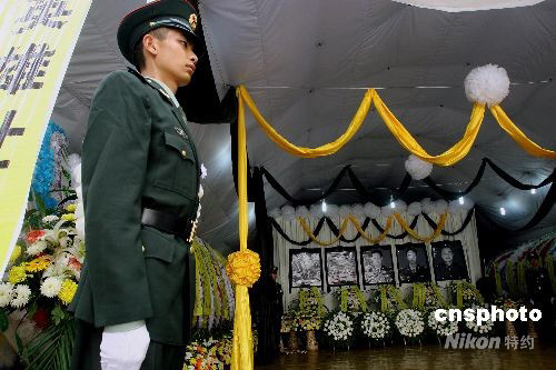6月13日,成都军区陆航团在凤凰山机场搭设灵堂,悼念在汶川大地震救灾行动中失事直升机上5位遇难机机组人员。中新社发 刘新 摄