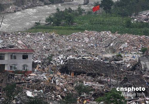 四川汶川大地震严重毁坏映秀镇,将映秀镇小学几乎全部摧毁为废墟。中新社发 贾国荣 摄