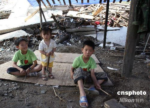 图:地震幸存双胞胎难舍震毁家园