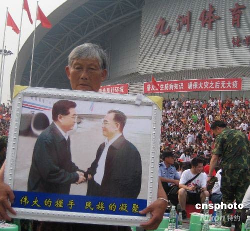 绵阳一受灾老妪手捧胡温合影观看慰问演出