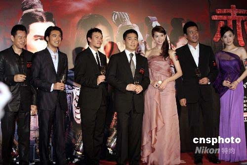 《赤壁》在香港举行慈善首映,剧中主要演员张丰毅、金城武、张震、梁朝伟、林志玲、胡军、宋佳(左至右)出席。中新社发 王丽南 摄