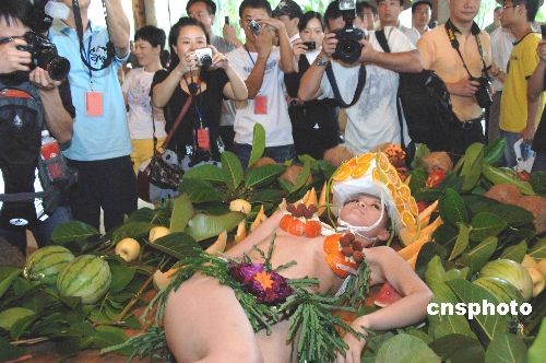 7月16日,广东佛冈一度假森林举行首届“冰果狂欢节”,当天景区方面特别炮制了一场“水果人体秀”,柠檬、红萝卜、樱桃、西瓜……全都变成了模特身上的衣物, 整个活动围绕“清凉”主题,将清凉夏日演绎到了极致,令游客大为称奇。中新社发 梁永强 摄