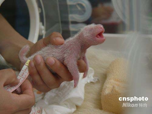 中国保护大熊猫研究中心雅安碧峰峡基地工作人员给熊猫幼仔量身长。中新社发 罗小韵 摄