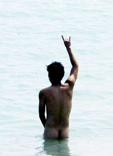 台湾电影“海角七号”票房十八日将破亿元(新台币),男主角范逸臣在拍片场景之一的垦丁海边,履行海里裸泳庆功诺言。