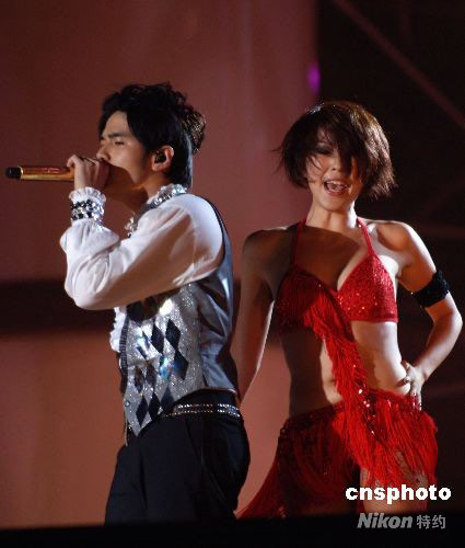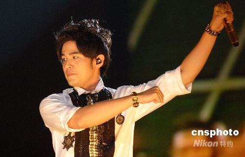 9月20日19时30分,“2008周杰伦世界巡回演唱会”在西安陕西省体育场演出。周杰伦在演唱会上大秀“奥运加油操”。中新社发 李海军 摄