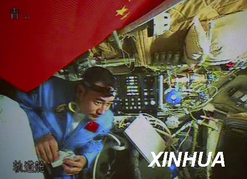 9月26日23时01分,手持食品袋的航天员翟志刚在神舟七号飞船轨道舱内进食(拍摄于北京航天飞行控制中心大屏幕)。新华社记者 查春明 摄