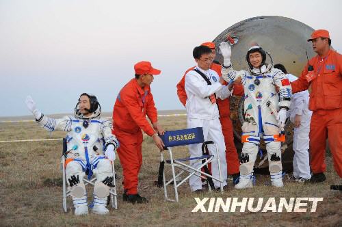 9月28日,神舟七号飞船返回舱顺利着落,三名航天员翟志刚、刘伯明、景海鹏在经过15-20分钟的重力再适应后全部出舱。首先出舱的是翟志刚,第二个出舱的是刘伯明,第三个出舱的是景海鹏。 在出舱后三位航天员接受了记者简单的采访。
