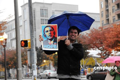 华盛顿街头一位奥巴马支持者举着写有“希望”字样的奥巴马像,号召人们抓紧时间“颗粒归仓”,把奥巴马送到白宫。