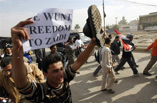 14日,伊拉克记者扎伊迪在招待会上向布什扔出自己的鞋子,并高声辱骂布什。凭借此举扎伊迪一夜成名,成为整个阿拉伯世界的“斗士”。