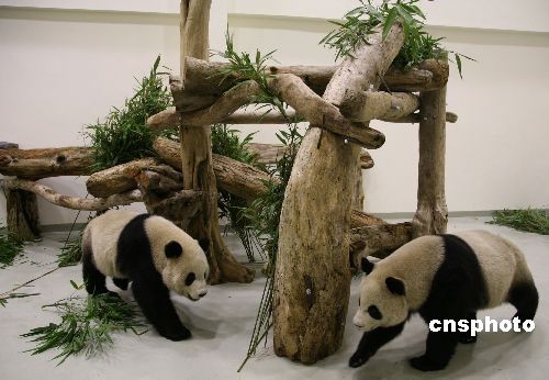 图为经历了一天旅途劳顿的“团团”和“圆圆”在新房间里团聚。 中新社发 路梅 摄