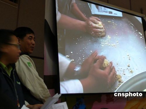 大陆赠台一对大熊猫“团团”和“圆圆”二十三日晚间抵达台北,住进台北市立动物园的新光特展馆。图为动物园发言人金仕谦(左二)介绍大熊猫的精制饲料——窝窝头的做法。 中新社发 路梅 摄