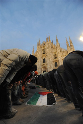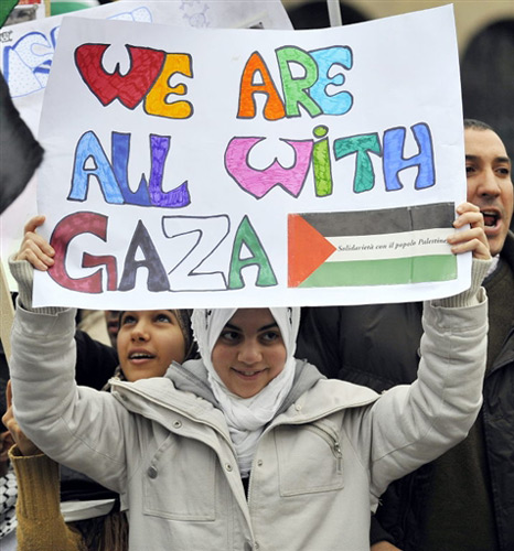 1月3日,在意大利米兰,当地群众举行集会活动,对在加沙地区遭空袭的巴勒斯坦死难者进行祈祷,抗议以色列袭击加沙。