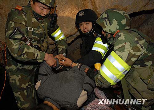 公安干警和武警战士正在对山洞中地下兵工厂内的犯罪嫌疑人实施抓捕。刘潺 摄