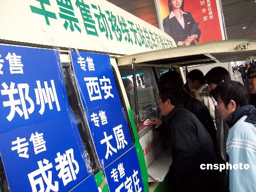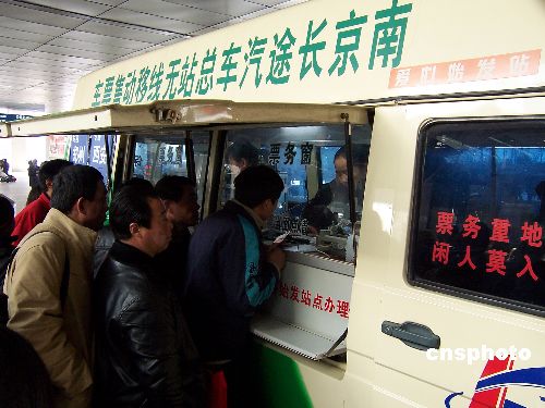 2009年1月10日,旅客在南京市一辆流动售票车前排队购买春运汽车票。春运来临,江苏省南京市交通运输部门在车站广场和市区繁华路段设立了流动售票车,既缓解了车站集中售票的人流压力,又使旅客体验到了春运购票的便捷。中新社发 王启明 摄