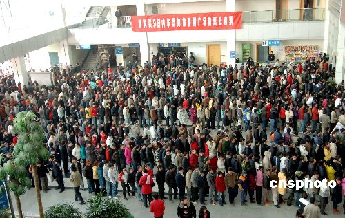 1月11日,中国春运首日早晨,福州火车站售票大厅内挤满了等待购买春运期间返乡火车票的旅客。春运期间,福建省客运量将超8000万人次,比去年增长1.9%。其中铁路360万人次,增长2.3%。中新社发 刘可耕 摄