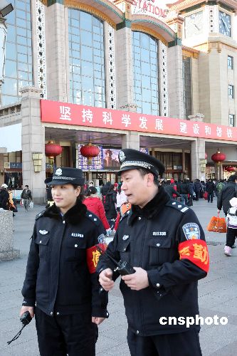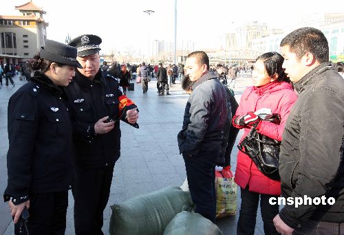 1月11日,2009年春运正式开始,北京警方启动“服务旅客、平安春运”活动,为旅客发放安全提示卡,张贴海报介绍购票、乘车等出行注意事项,确保市民度过一个安全、快乐的春节。中新社发 任海霞 摄