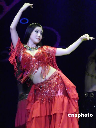 1月13日,广西电视台2009新春热舞晚会在广西电视台演播厅录制。晚会汇聚了时下最流行的各种热舞:街舞、钢管舞、肚皮舞、啦啦操等。中国肚皮舞皇后温可馨的肚皮舞《中东鼓韵》,把晚会推向高潮。中新社发 骆文刚 摄