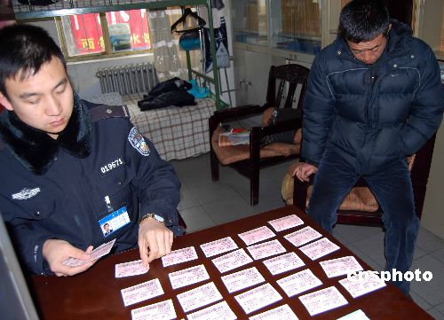春节前夕,北京警方开展为期10天的打击春运倒卖火车票专项行动,以遏制辖区内倒卖火车票的违法活动,并封堵和删除互联网上发布的各类倒票信息。中新社发 欧阳文 摄