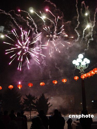 1月25日晚,农历除夕,中国兵器工业集团齐齐哈尔建华公司在广场举行迎春秧歌焰火晚会。中新社发 王云龙 摄