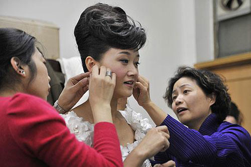 2009年春晚女星比艳,宋祖英、董卿、黄圣依春晚试装及服装制作过程首度曝光。宋祖英的礼服 最为富贵,全身绣满珍珠。