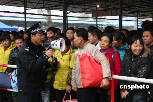 湖南衡阳火车站是湘南地区节后旅客最大的集散地,2009年1月31日以来,日发送旅客5.5万余人次,创历史新高。连日来,衡阳铁路公安处全警出动,分布在衡阳火车站安检口、售票厅、站台等岗位,组织旅客有序进站,确保广大旅客群众出行安全。中新社发 刘爱成 摄