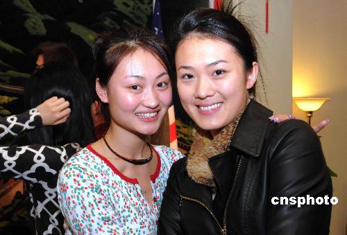 两位中央民族歌舞团美女演员在欢迎招待会上合影留念。中新社发 邱江波 摄
