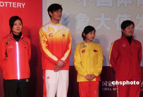 2月17日,中国国家体育总局体育彩票管理中心在北京举行仪式,聘请六位体育明星担任中国体育彩票公益形象大使。其中有杜丽、仲满、何雯娜、张娟娟(从左至右)等四位北京奥运会冠军。中新社发 沈晨 摄