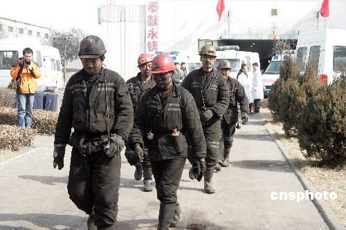 二月二十二日凌晨二时十七分,山西焦煤集团西山煤电屯兰煤矿发生瓦斯爆炸事故,目前已造成四十四人遇难。图为已安全升井的矿工。中新社发 张云 摄