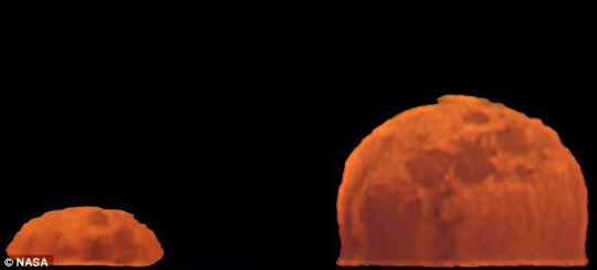 月亮的“融化”。一位名叫约翰·斯特森的美国业余摄影师拍摄到一组月亮蜃景的壮观照片。这种罕见的天文现象是因不同温度的层层空气使月光弯曲形成的。