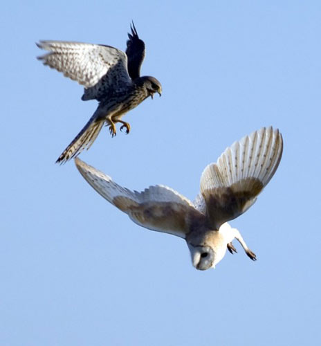 猛禽“空战”。图为一只谷仓猫头鹰在白天觅食时遭到两只茶隼的伏击的照片。