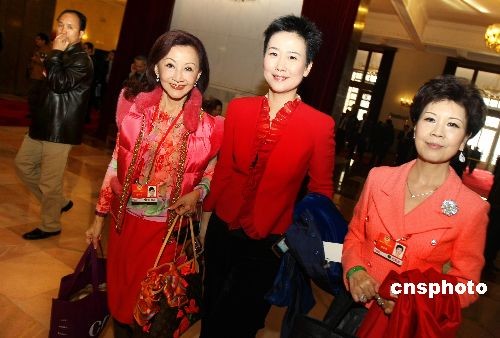 3月8日,全国政协十一届二次会议举行第三次全体会议。图为李小琳(中)、郑明明(左)等女委员着鲜艳服装参加会议。中新社发 傅丹丹 摄