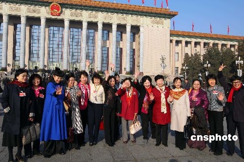3月8日,全国政协十一届二次会议第三次全体会议在北京人民大会堂举行,参加会议的女委员在大会堂前合影,庆祝国际妇女节。中新社发 盛佳鹏 摄