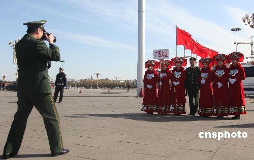 3月9日,十一届全国人大二次会议第二次全体会议在人民大会堂举行。解放军为礼仪小姐拍照留念。中新社发 张娅子 摄