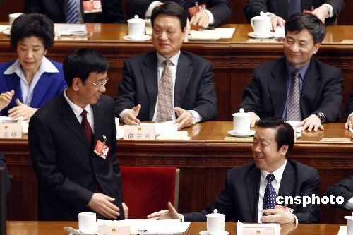 3月10日,十一届全国人大二次会议在北京人民大会堂举行第三次全体会议,最高人民法院院长王胜俊、最高人民检察院检察长曹建明分别作工作报告。图为曹建明作完报告回到座位后与王胜俊握手。中新社发 盛佳鹏 摄