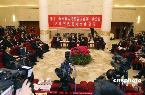 3月11日,出席十一届全国人大二次会议的四川代表团在北京人民大会堂举行全体会议,向中外媒体开放并接受记者提问。
