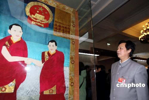 全国政协文艺界委员、扮演“毛泽东”的演员汪国新,3月11日参观在北京民族宫举办的西藏民主改革50年大型展览。中新社发 傅丹丹 摄