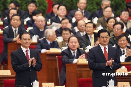 3月12日,全国政协十一届二次会议举行闭幕大会。国家主席胡锦涛、国务院总理温家宝为通过政治决议鼓掌。中新社发 盛佳鹏 摄